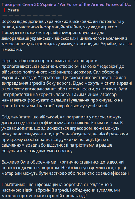 "Це не є свідченням зради або відсутності патріотизму, а радше результатом складних умов полону", — наголосили в Повітряних силах.